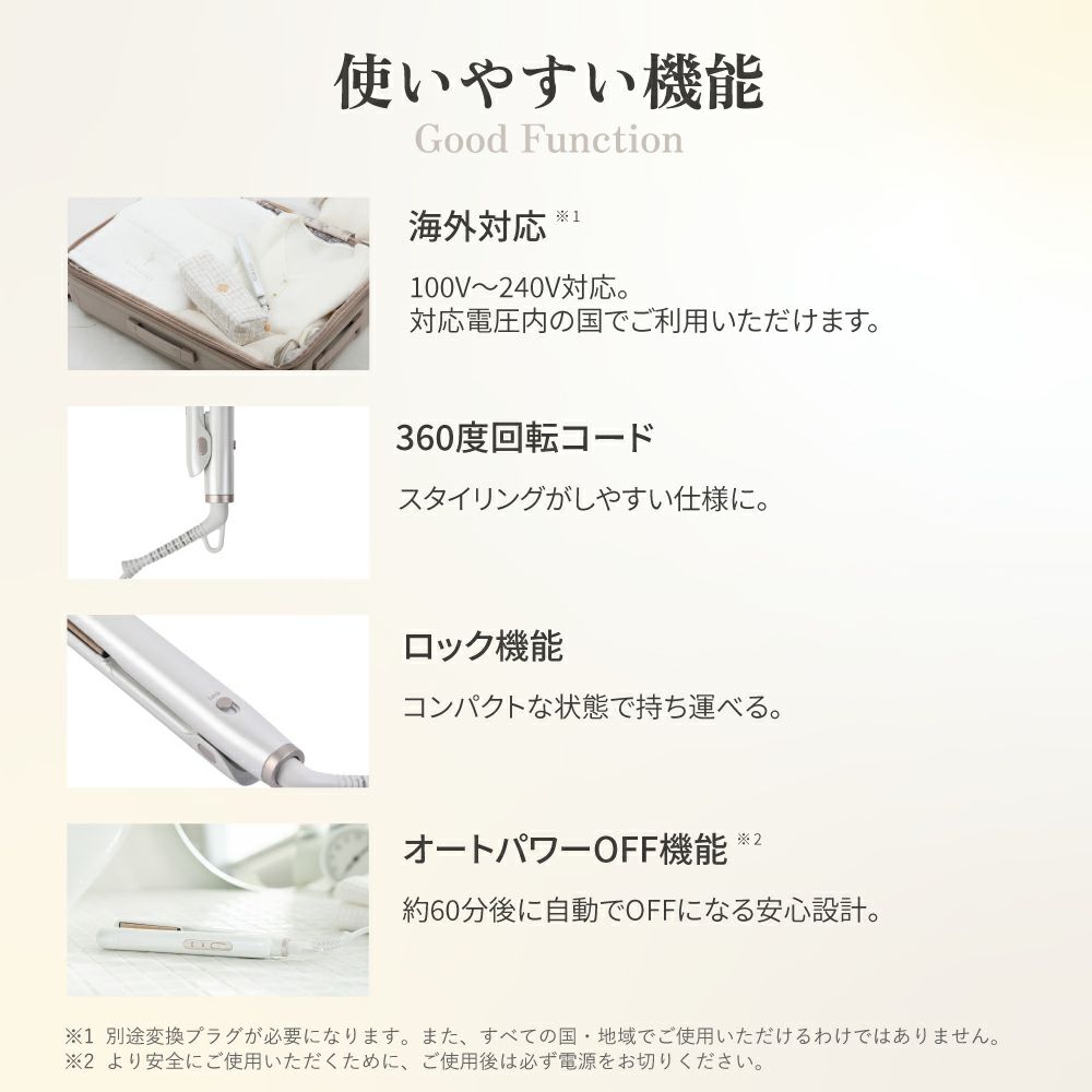 他の画像を見る KINUJO Luxejewel ラグジュエル 販売価格 ¥ 22,000 税込 (0) いつでも、どこでもスタイリングができる 充電式コードレス ストレートアイロン 詳細を見る お気に入りに登録する
